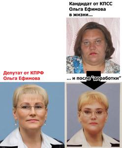 Внешне капээсэсный кандидат Ефимова ничем не похожа на депутата от КПРФ Ольгу Ефимову. Но не беда, решили шарлатаны от политтехнологий: живьем ее никому показывать не надо, а фотографию кандидата на стенды в избиркоме и на участках можно и «подшаманить», добиться портретного сходства с помощью фотошопа. Прическа, очки, макияж с фото нашей Ефимовой просто срисованы, а вот шея с воротником блузки и уши без стеснения вырезаны с официальной фотографии депутата Ольги Ефимовой и присобачены к голове кандидата КПСС. Просто франкенштейны работали! Сравните, насколько изображение на «фото кандидата» похоже на самого кандидата (фото без фотошопа) и насколько – на нашу Ольгу Ефимову! Но избирком абсолютно не смущает, что кандидат на фото на себя не похож, и это фейковое фото вешают на информационный стенд!