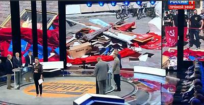 Увы, но сторонники «декоммунизации» обнаружились и среди российских экспертов, присутствующих в студии. «Яблочник» Николай Рыбаков заявил, что установленный в результате переворота 1917 года «коммунистический режим» тоже нанес России большой ущерб. «Знаете, чем отличается революция от переворота? – возразил ему Юрий Афонин. – Если после смены власти дворец олигарха А оказался у олигарха Б – это переворот, как на Украине, а если дворец олигарха А стал детским домом или дворцом пионеров – это революция. В Октябре была революция». Увлеченному подсчетом «жертв коммунизма» представителю «Яблока» Афонин посоветовал покаяться за 1990-е годы, которые по количеству жертв многократно превзошли даже период репрессий.