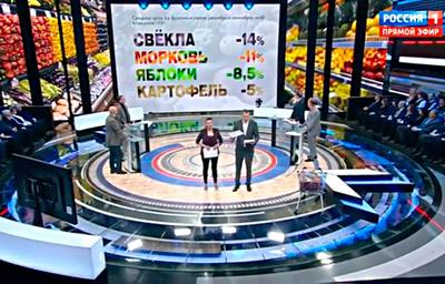 В ходе программы ведущие предприняли очень характерную для российских государственных СМИ попытку с помощью подобранных определенным образом новостей нарисовать картину роста уровня жизни россиян. На этот раз гостям студии было предложено обсудить новость о том, что в октябре в России якобы на 1% снизились цены на плодоовощную продукцию. Хотя это не официальные данные Росстата, а всего лишь тезис из аналитического обзора банка «ВТБ Капитал». При этом в программе особо подчеркивалось, что снижение цен в октябре по сравнению с сентябрем произошло впервые за последние 6 лет. К «раскрутке» этой новости подключился и Минсельхоз РФ, заявивший, что снижение цен, по его мнению, связано с хорошим урожаем овощей в теплицах.