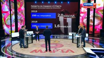 На этом фоне в программе «60 минут» были приведены такие факты: год от года российские мужчины берут всё больше микрозаймов, чтобы поздравить 8 марта женщин: в 2018 году их было 220 тысяч на общую сумму 1,6 млрд рублей, а в этом – уже 250 тысяч на 2 млрд. Одновременно за год состояние пятерых богатейших олигархов России выросло от 1,8 до 6 млрд рублей у каждого и составило от 20 до 24 млрд.