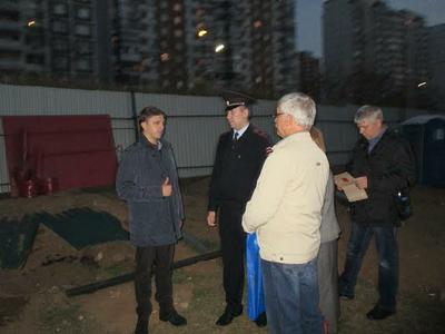 А.Е.Клычков настоял, чтобы майор прошел с ним как с депутатом Мосгордумы и с некоторыми жителями, на строительную площадку, чтобы удостовериться в наличии у застройщиков оригиналов всех необходимых строительных документов. Зайдя на площадку, мы обнаружили замок на двери будки строительной компании, отсутствие сторожей, которые обязаны следить за безопасностью на объекте. Зато спокойно висят газовые баллоны, разбросан строительный мусор. Если вдруг на стройке окажутся дети, может произойти непоправимая трагедия. На требование депутата составить рапорт о всех выявленных нарушениях участковый майор полиции отказался, зато предложил жителям вызвать полицию (!), дабы в его полномочия как участкового написание рапорта о нарушениях не входит! И как в обычном анекдоте после вызова полиции перед жителями вновь предстали два сержанта, которых совсем недавно этот самый участковый отправил сидеть в полицейскую машину.