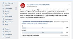 В центральной группе КПРФ в социальной сети ВКонтакте запущено голосование, в ходе которого любой желающий может высказать свое отношение к попыткам единороссов приравнять встречи депутатов с избирателями к митингам.