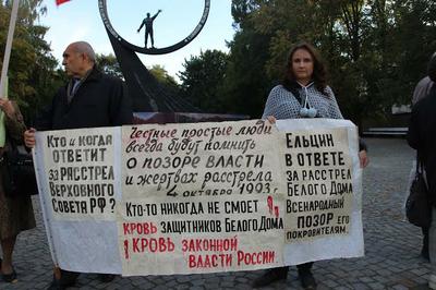 «Кто и когда ответил за расстрел Верховного Совета РФ? Честные простые люди всегда будут помнить о позоре власти и жертвах расстрела 4 октября», - такие слова были на главном транспаранте пикета. Надписи на других транспарантах касались актуальных тем современности: «Буржуазное правительство в отставку!», «Капитализм – война! Социализм – мир!», «Социализм живет и будет жить!»