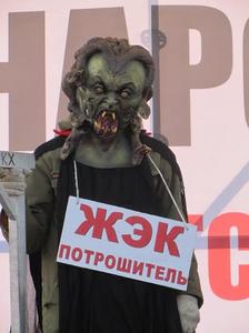 Во время мероприятие молодежь разыграла небольшое представление: добрый молодец под бурные аплодисменты скрутил и стащил со сцены «Жэка-потрошителя», символизирующего политику нынешнего правительства в сфере ЖКХ.