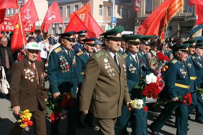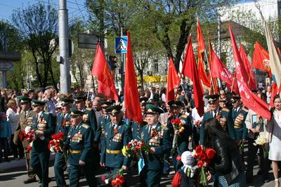Торжественное шествие в Калуге в День Победы прошло под Красными Знамёнами.