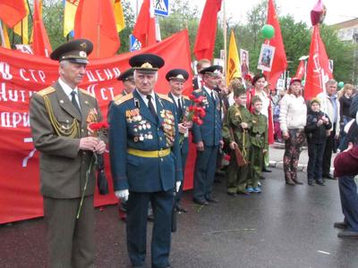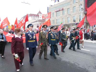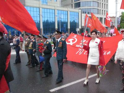 Колонна под красными знаменами, с портретами Сталина и полководцев Победы начала движение от сквера Мира. Впереди – Знамя Победы. Возглавляют колонну ветераны Великой Отечественной войны и Вооруженных сил. «Да здравствует 74-я годовщина Великой Победы!», «Слава советскому воину-победителю!» – скандируют участники шествия, – «Да здравствует Генералиссимус Победы Иосиф Виссарионович Сталин!», «Да здравствует Коммунистическая партия — партия Победы», «Возродим мощь и былую славу вооруженных сил!».