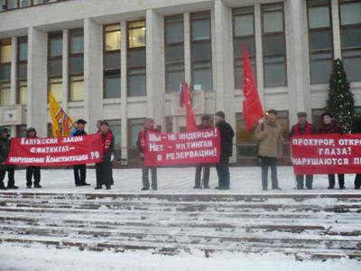 Коммунисты вышли с лозунгами: «Прокурор открой глаза – нарушаются права!», «Калужский закон о митингах – нарушение Конституции РФ!», «Мы – не индейцы! Нет – митингам в резервации!». Коммунистов во время проведения акции поддержала «Справедливая Россия». Депутатам, областным чиновникам и представителям СМИ было направлено заявление калужских коммунистов.