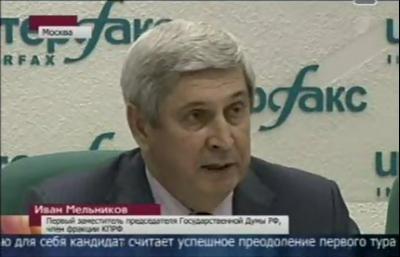 ИВАН МЕЛЬНИКОВ (ПЕРВЫЙ ЗАМЕСТИТЕЛЬ ПРЕДСЕДАТЕЛЯ ГОСУДАРСТВЕННОЙ ДУМЫ РФ, ЧЛЕН ФРАКЦИИ КПРФ): Мы ставим перед собой такую задачу, чтобы на первом этапе решить сложную, но реальную задачу - выход во второй тур. Вообще в целом я хочу сказать, что пора забывать о том времени, когда на всех выборах была монополия партии власти. Я уверен, что наступают другие времена, когда победа представителя оппозиционной партии будет становиться нормой нашей жизни.