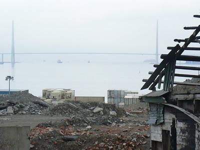 3.Парадная сторона Владивостока — мост на остров Русский, и изнанка — сгоревший дом вот уже в течение трёх лет городские власти никак не могут разобрать.