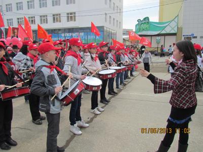 В числе демонстрантов нынче много молодежи. Особенно украсил колонну отряд юных барабанщиков — юных ленинцев, представляющих Якутскую городскую пионерскую организацию под руководством старших пионервожатых Анатолия Товарова и Людмилы Оконешниковой.