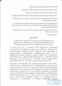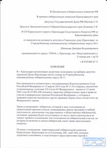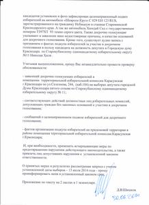 Вышеизложенные факты нарушений законодательства приведены, в частности, в обращениях в мой адрес кандидата в депутаты в Городскую думу Краснодара по Старокубанскому одномандатному избирательному округу №11 Шишкова Дмитрия Владимировича.