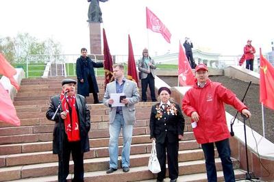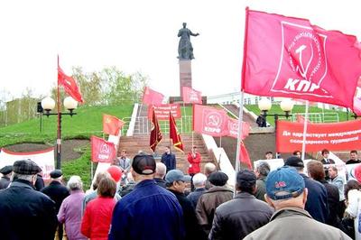 Митинг республиканского отделения КПРФ 1 мая был далеко слышен еще до его начала. Из динамиков звучали песни советского времени, играл баянист. Стояли красные палатки, где все желающие могли взять газеты и воздушные шары с партийной символикой. Митинг по традиции открылся "Интернационалом". Между выступлениями ораторов в паузы маршами вступал духовой оркестр.