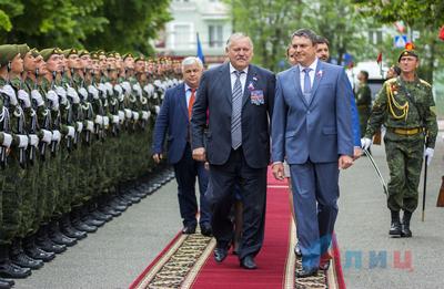 Глава ЛНР Леонид Пасечник встретил иностранных гостей, наиболее многочисленной стала делегация почетных гостей из Российской Федерации, в числе которой член комитета Совета Федерации по международным делам Сергей Цеков, депутаты Государственной Думы Казбек Тайсаев, Константин Затулин, Наталья Поклонская, Андрей Козенко, Александр Ющенко и другие.
