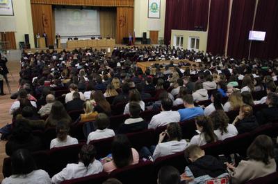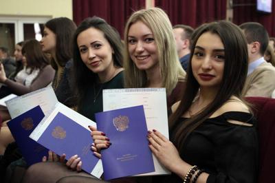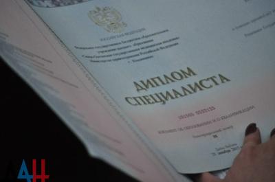 «Сегодня проходит очередное вручение дипломов российского образца, однако оно не совсем обычное, так как в зале присутствуют депутаты Государственной Думы РФ Виктор Водолацкий и Казбек Тайсаев. Это один из таких дней, по которому можно сказать: наше будущее — Россия, и мы будем получать хорошее и качественное образование, несмотря на слова Петра Порошенко о том, что наши дети будут сидеть в подвалах.