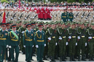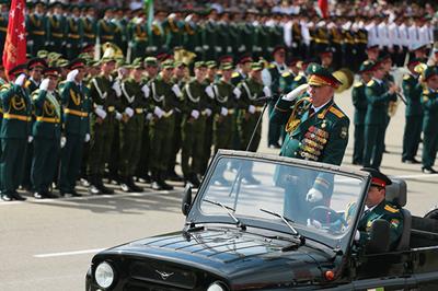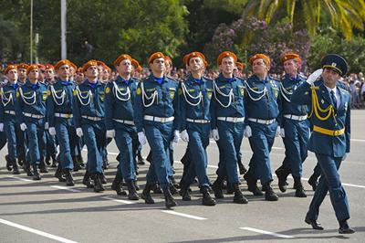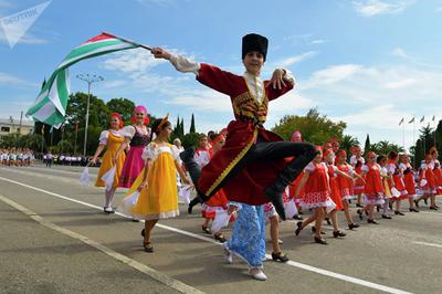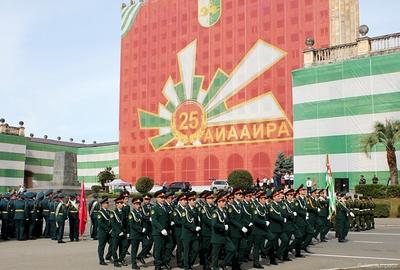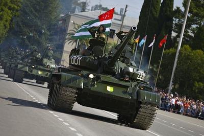 Далее в столице Республике – Сухум прошел военный парад, в составе которого ровным строем прошли военнослужащие абхазской армии, более 100 единиц военной техники: БМП, БТР, батареи полковых минометов ПМ-120, зенитные установки противовоздушной обороны, гаубицы, установки реактивного огня «Град», командно-штабные машины для обеспечения связи, бронированный многоцелевой автомобиль повышенной проходимости «ТИГР», а также легендарный трофейный танк Т-55 с позывным «01» - легендарный танк был счастливым для абхазских бойцов, ни один член его экипажа не погиб в Отечественной войне. После этого состоялась авиационная часть парада: торжественным строем прошла боевая, транспортная, а также штурмовая авиация: вертолеты МИ-8, МИ-24, а штурмовики Л-39, оставляя за собой след из белых и зеленых цветов абхазского флага.