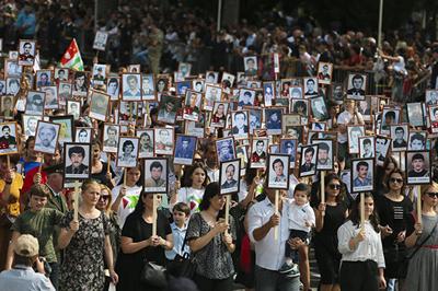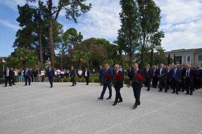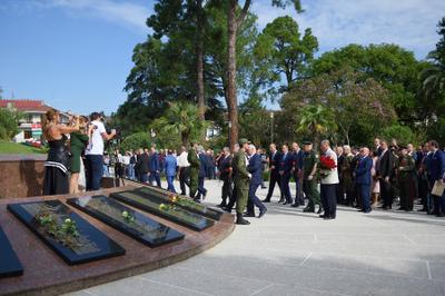 Далее члены официальных делегаций возложили цветы в парке Славы, у памятника погибшим в Отечественной войне Народа Абхазии. Шествие возглавили президент Абхазии Рауль Хаджимба и президент Южной Осетии Анатолий Бибилов, а также премьер-министр Абхазии Валерий Бганба и посол России в Абхазии Алексей Двинянин.