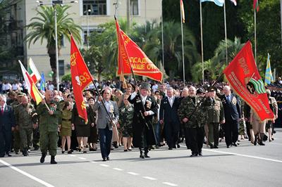 Следующим событием, прошедшим на Центральной площади столицы республики, стало торжественное шествие ветеранов Отечественной войны народа Абхазии. Праздничное шествие открыли бывшие бойцы и командиры Гумистинского и Восточного фронтов. В самом начале колонны пронесли Знамя Победы, а также братский осетинский флаг.