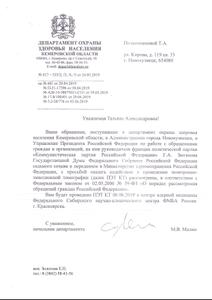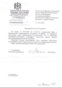 Результат от переписки наступил только после того, как Т.А. Полковникова обратилась к Руководителю фракции в Государственной Думе Г.А. Зюганову. Депутат-коммунист направил запрос в Министерство здравоохранения Российской Федерации. И неповоротливый бюрократический механизм сдвинулся с мёртвой точки. Из федерального министерства обращение было перенаправлено региональным чиновникам, курирующим медицину. Вопрос решился положительно. Из департамента охраны здоровья населения Кемеровской области лидеру Компартии пришёл ответ, что Т.А. Полковниковой будет проведено необходимое обследование в центре ядерной медицины Федерального Сибирского научно-клинического центра ФМБА России г. Красноярска в рамках обязательного медицинского страхования.