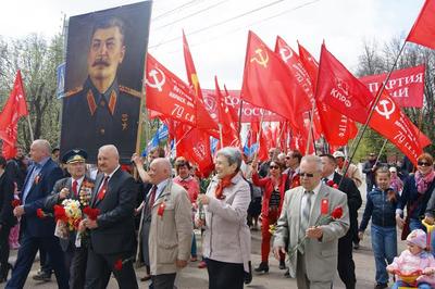 Стоявшие плотной стеной по маршруту следования колонны жители города радостно приветствовали участников шествия, подхватывали лозунги и кричалки КПРФ, охотно фотографировались на фоне большого портрета Сталина.