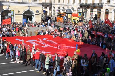 Вместе с ветеранами Великой Отечественной войны по Невскому проспекту до Дворцовой площади под Знаменами Победы прошли представители всех поколений, продемонстрировав, что ленинградцы бережно хранят память о тех, кто защищал свою Родину, о тех, кто героически погиб в сражениях, о тех, кто, не жалея сил, трудился в эти суровые годы в тылу.