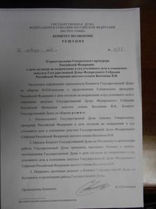 22 января Комитет ГД по обороне отказал генпрокуратуре в даче согласия на направление в суд уголовного дела в отношении депутата ГД В.И. Бессонова.