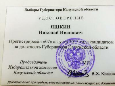 В пятницу, 7 августа, в 16.33 по Московскому времени в Калужской областной избирательной комиссии вручено удостоверение кандидату в Губернаторы области коммунисту Николаю Яшкину.