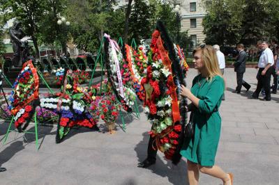 Выстроившись на площади, коммунисты и их сторонники застыли в минуте молчания и, пропустив вперёд ветеранов, совершили торжественное возложение венков и цветов к Вечному огню.