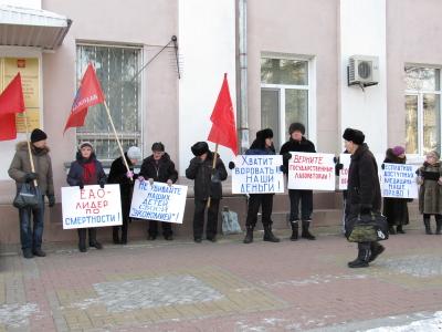 Оснастить медицинские учреждения Еврейской автономной области современным медицинским оборудованием, восстановить государственные лаборатории, обеспечить выполнение конституционного права граждан на бесплатную медицинскую помощь — с такими лозунгами вышли сегодня к зданию управления здравоохранения правительства ЕАО коммунисты Биробиджана.