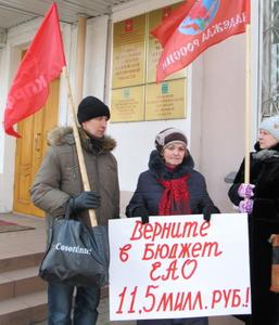 Пикет, организованный совместными силами общественных организаций — коммунистической партией Российской Федерации и Всероссийской женской организации «Надежда России», привлек внимание горожан и гостей столицы ЕАО. Многие единодушно поддержали требования пикетировавших. Люди охотно соглашались подписаться под протестным письмом в адрес правительства ЕАО, в котором выражается недовольство реформой здравоохранения, проводимой в регионе и выдвигается категоричное требование: отправить бездарных чиновников от медицины в отставку.