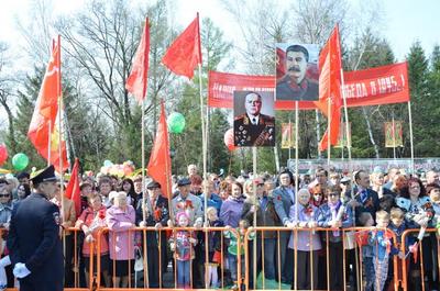 Коммунисты Еврейской автономной области встретили День Победы традиционно под красными стягами и портретами военачальников — Верховного главнокомандующего генералиссимуса И. Сталина и маршала СССР Г. Жукова.