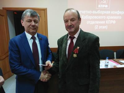 Началась конференция с традиционного вручения партийных билетов молодым коммунистам – краевая организация пополнилась пятью новыми членами партии, которые получили партийные документы из рук Первого секретаря Хабаровского краевого комитета КПРФ А.П. Громова. От имени ЦК КПРФ Д.Г. Новиков вручил две высокие партийные награды – орденом «Партийная доблесть» был награжден первый секретарь Комсомольского-на-Амуре горкома КПРФ Ю.В. Желдак, а орден «Партийная слава» получил член бюро Комсомольского-на-Амуре горкома КПРФ С.И. Чернышов.