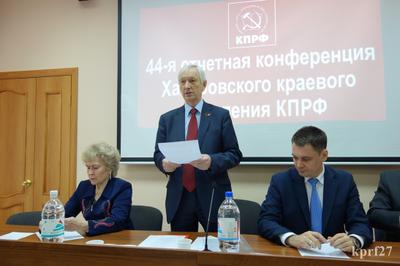 С отчетным докладом выступил первый секретарь Хабаровского краевого комитета КПРФ А.П. Громов, охарактеризовавший основные направления работы краевого комитета КПРФ, главные итоги деятельности коммунистов края и перспективы. С докладом выступил председатель краевой контрольно-ревизионной комиссии В.Е. Копылов. В прениях по докладам высказались: