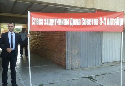 Участники митинга вышли на памятную акцию под красными флагами и лозунгами: «Время подтвердило нашу правоту», «Слава защитникам Дома Советов 3-4 октября» и др.