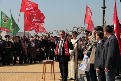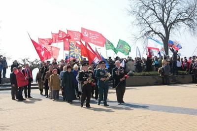 Переправившись в Крым рано утром, кубанцы вместе с керченскими товарищами прибыли на Аллею Славы Героев, где возложили цветы и венок к Вечному Огню. Далее коммунисты проследовали к монументу памяти Героев на гору Митридат. Там состоялся митинг. Со словами поздравления к жителям города, ветеранам и молодежи обратился А.Тренин, который подчеркнул высокую значимость праздника, проходящего вскоре после воссоединения Крыма с Россией, а также передал привет от коммунистов краевого отделения КПРФ.