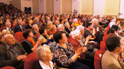 Большой зал дворца, рассчитанный более чем на 500 человек, был полон народу. На мероприятие пришли не только курганцы, но и приехали представители многих районов области,в том числе, из города Шадринска, Варгашинского, Далматовского, Звериноголовского, Каргапольского, Мишкинского, Мокроусовского, Притобольного, Шумихинского и других районов. У входа в концертный зал звучали песни военных лет, а юноши и девушки в военной форме раздавали поздравления с Днем Победы в форме солдатских треугольников.