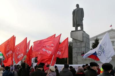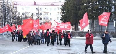 Коммунисты пришли на народный сход своей ярко-красной колонной, над головой лозунги, реют знамена Великой Победы, СССР, КПРФ, ЛКСМ.