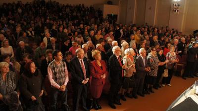 В 12 часов началось основное мероприятие — торжественное заседание и концерт во Дворце культуры железнодорожников. Большой зал дворца, который вмещает около 600 человек, был переполнен. Люди стояли даже в проходе, пришлось вносить дополнительные стулья. Гостей встречали пионеры в красных галстуках.