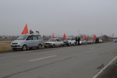 По мере следования колонны автомобилей к ней присоединялись коммунисты местных партийных организаций. Стартовала автоколонна в городе Черногорске. С красными полотнищами и агитационными лозунгами автомобили проследовали по центральным улицам Черногорска. Жители приветствовали красную колонну автомобильными сигналами. Из города горняков колонна проследовала в районный центр - поселок Усть-Абакан, где к ней присоединились местные коммунисты. Далее агитавтомобили проехали по улицам столицы Хакасии города Абакана. Закончился пробег в районном центре Алтайского района Белом Яре. Печально, что во всех городах и районных центрах Хакасии, охваченных автопробегом, отсутствуют градообразующие предприятия. Старые заводы, шахты разорили, растащили, новые не построили. Города купи-продай и охранников. Невеселые реалии современной России. Пробег проходил в течение четырех часов, комсомольцы проехали восемьдесят километров, охватили агитацией более 250-ти тысяч жителей.