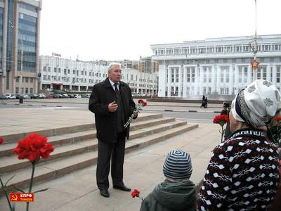Перед собравшимися выступил первый секретарь Тамбовского обкома КПРФ А.И. Жидков. Андрей Игоревич отметил выдающуюся роль Ленина в мировой и отечественной истории. В.И. Ленин вместе с Коммунистической партией впервые в мире соединил теорию социализма с рабочим движением, борьбу рабочих за экономические требования с политической борьбой против самодержавия. Его гениальная идея союза рабочего класса и крестьянства подняла на борьбу против эксплуататоров всё эксплуатируемое население страны.