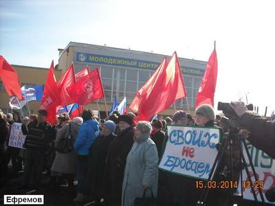 По городам Тульской области прокатилась волна митингов в связи с событиями на Украине. Их общий лейтмотив: «Своих не бросаем!», «Крым – это Россия», «НЕТ разгулу фашизма!» В этих акциях самое активное участие приняли активисты местных отделений КПРФ.