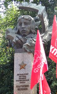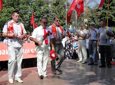 “Коммунисты Украины, мы с вами!”, “Фашисты, геть с Украины!” - с такими лозунгами, а еще со специально изготовленным большим флагом Донецкой народной республики курские коммунисты, сторонники и союзники с алыми флагами вновь вышли на главную улицу областного центра. У памятника Кати Зеленко состоялся пикет. Сюда пришли многие десятки детей войны, тех, кто воочию видел ее ужасы и кто не желает ее повторения.