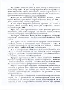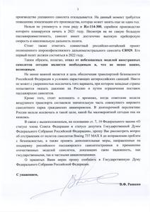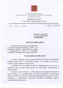 В связи с вышеизложенным, на основании ст. 7, 14 Федерального закона «О статусе члена Совета Федерации и статусе депутата Государственной Думы Федерального Собрания Российской Федерации», прошу Вас рассмотреть вопрос об отстранении от полетов самолетов Boeing 737 MAX 8 до исправления проблем с безопасностью, а также принять дополнительные меры, направленные на поддержку российского пассажирского самолетостроения и применение отечественных моделей самолетов, доказавших свою надежность, как государственными, так и частными авиакомпаниями.