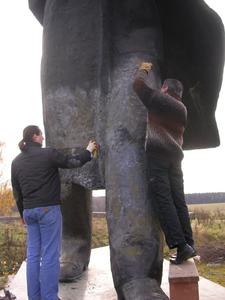 В воскресенье 20 октября коммунисты Ленинского района Подмосковья во главе с первым секретарем Н.Д.Кузовковым и вторым секретарем В.Е.Глотовым, вооружившись необходимым инвентарем, прибыли к монументу с твердым намерением очистить памятник Ильичу. Вандалы испачкали краской ноги монументального Ленина и постамент - и именно с этим коммунистам и предстояло справиться.
