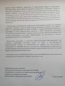 Активисты ЛКСМ РФ и независимого студенческого профсоюза "Дискурс" поддержали требования обучающихся. На имя Министра науки и высшего образования Российской Федерации В.Н. Фалькова было направлено письмо с требованием мер поддержки для студентов в условиях распространения коронавирусной инфекции, а на сайте change.org размещена петиция к президенту РФ. Также, был запущен фотофлешмоб, в ходе которого участниками публикуются в социальных сетях фотография с призывом перезачёта оплаты за обучение. Кроме того, депутаты-комсомольцы и члены молодёжных парламентов направили обращение на имя руководителей регионов с требованием поддержки данной инициативы. Соответствующие обращения направлены губернаторам Белгородской, Калужской, Пензенской, Свердловской областей, а также города Севастополь.