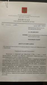 Депутат Госдумы от Краснодарского края (фракция КПРФ) С.П. Обухов направил депутатский запрос Председателю Правительства РФ Д.А. Медведеву. Копия запроса направлена главе администрации (губернатору) Краснодарского края В.И. Кондратьеву.