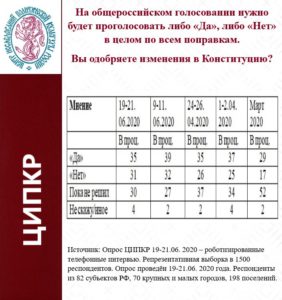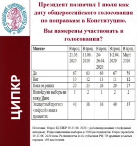 Примечание: Формулировки вопросов в опросах от 24-26.04, 1-1.04, в марте отличались от июньской в связи с назначением голосования на 22 апреля, а потом его отменой.