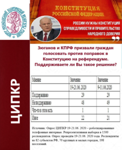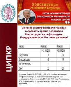 - Отношение избирательного корпуса к призыву лидера КПРФ Г.А.Зюганова проголосовать против президентской поправки в Конституцию показывает, что поддержка гораздо шире традиционного электората КПРФ. Позицию лидера КПРФ разделяет почти треть избирателей.