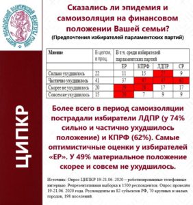 - Более всего в период самоизоляции пострадали избиратели ЛДПР и КПРФ. Самые оптимистичные оценки у избирателей «Единой России». В условиях эпидемии на партию власти ориентируются преимущественно слои менее всего пострадавшие из-за кризиса и карантина.