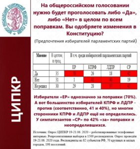 Относительное большинство избирателей КПРФ и ЛДПР, соответственно и 41 и 40% при трети неопределившихся (точнее, 28 и 37% соответствующих сторонников этих партий) намерены твердо голосовать «против» поправки. На этом фоне смешно выглядят нападки лидера ЛДПР Жириновского на КПРФ за призыв голосовать «против». Как видим, электорат ЛДПР также как и КПРФ наиболее пострадавший от карантина и кризиса, также как и коммунистический в большинстве своем также намерен голосовать против президентской поправки.
