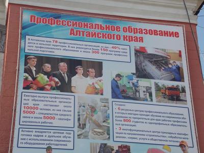 Если перейти на другую сторону площади Октября от Молодежного театра (где состоялась нынешняя встреча губернатора с выпускниками), то можно прочесть на красочном плакате на стене ДК Профтехобразования (проспект Ленина, 89): "В Алтайском крае 78 профессиональных организаций, из них - 40% находятся в сельской местности. В них реализуется более 150 программ среднего профессионального образования и около 300 программ профессиональной подготовки".